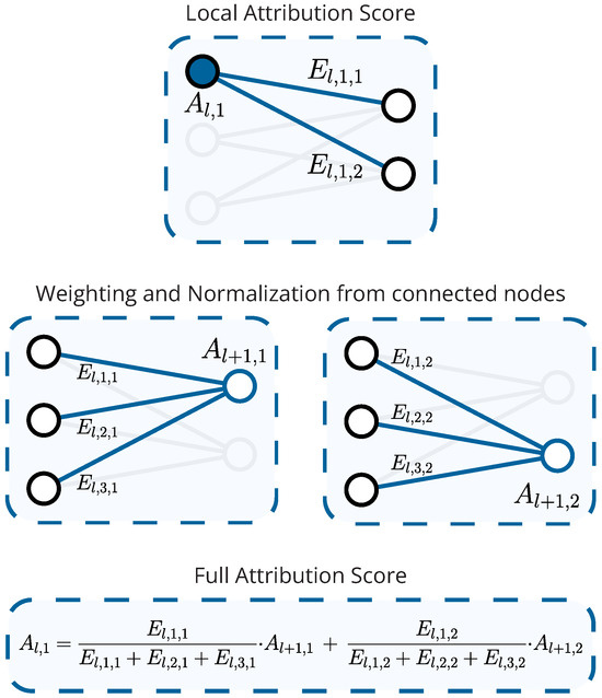 This attribution score captures the global importance of a node, as it accounts for more than just the activations on its outbound edges via , which are highly local. Instead, is adjusted by the attribution scores of all subsequent nodes, j, that are linked to node i. Additionally, for each of these subsequent nodes, the expression is also normalized by , which takes into account all activations on that node’s inbound edges. Essentially, the recursive relation in Equation (8) ensures that the importance of the i-th node in the l-th layer reflects that node’s contributions on the entire network downstream from the node, underscoring its global nature. The attribution scoring mechanism is illustrated for an example architecture in Figure 1, which provides a visual representation of how each node’s score is influenced by subsequent nodes and the activations along their connecting edges.