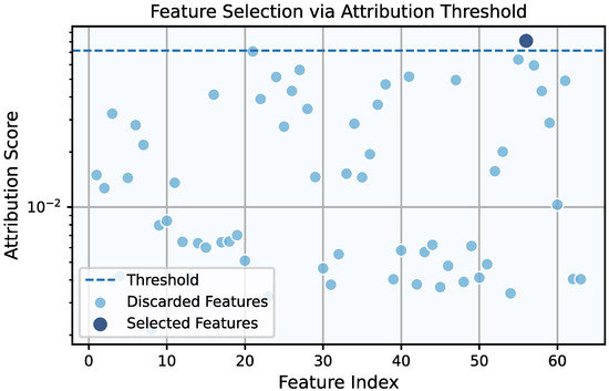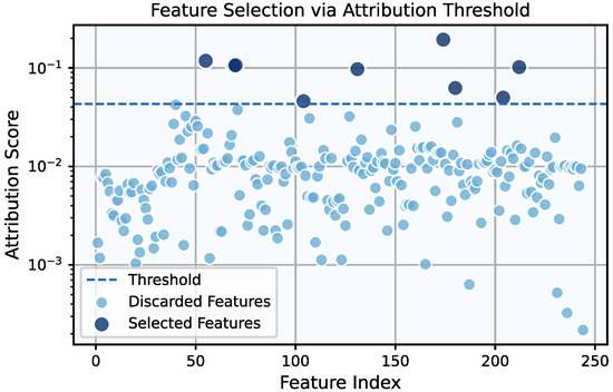 where is a hyper-parameter which determines the threshold for feature selection. To ensure an appropriate choice of , multiple threshold values are evaluated, drawn from a discretized range , to identify the most significant features. As a result, each combination of corresponds to a distinct selection of important features.