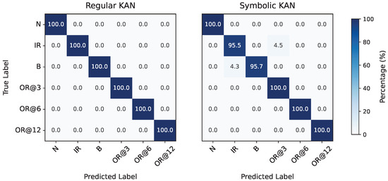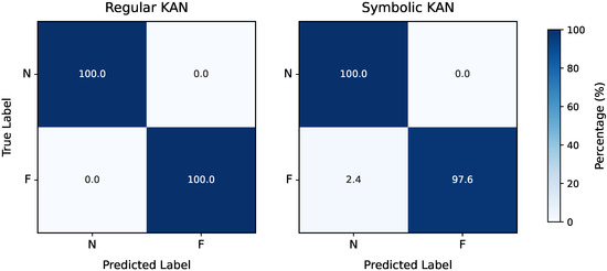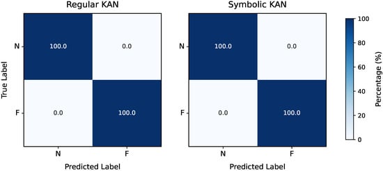 Following this preprocessing step, the framework’s feature selection process, as detailed in Section 2, was applied to identify the most relevant features for fault detection. Regarding the CWRU dataset, the Pareto front resulting from the grid search was a singleton, yielding and . These values resulted in the selection of a single feature, (the 25th percentile value for the drive-end signal; see Appendix B), as illustrated in Figure 3. Proceeding to the model selection phase, the grid search using only this feature again produced a Pareto front with a single point, corresponding to and . Based on Equation (6), the resulting KAN model comprised only 28 trainable parameters. The combination of a single feature and a small yet fully adaptive grid suggests that fault detection in the CWRU dataset is relatively straightforward, so approaching the task with a complex model is neither necessary nor a good practice. This is further corroborated by the final evaluation of the chosen model, for both the regular and symbolic versions of the KAN, as shown in the confusion matrices of Figure 4.
