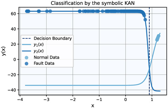 where x denotes the scaled feature and is the sigmoid function. It is noted that all numbers have been rounded to the second digit. Using these analytical expressions, a sample is classified as normal if , and as a fault if . Equations (14) and (15) allow for the study of otherwise inaccessible (or hard to compute) properties of the classification problem, such as determining the decision boundary by solving . Figure 5 illustrates the two curves alongside all CWRU data points, color-coded by class. The decision boundary is also depicted, demonstrating that all of the dataset’s samples are correctly classified using these symbolic expressions.