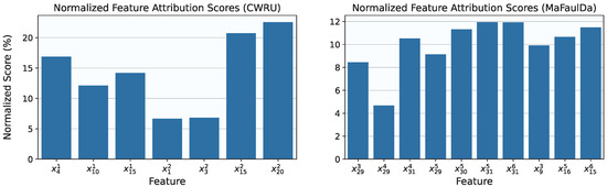 Normalized feature attribution scores after training the final model on the CWRU (left) and MaFaulDa (right) datasets.