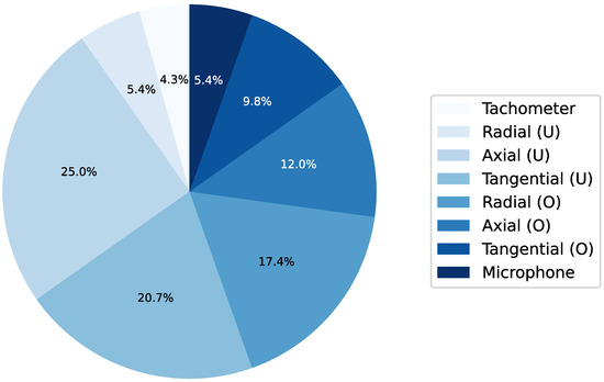 For time–frequency features, wavelet transformations were employed, as they are highly effective for identifying machinery faults. The pywavelets library [61] was used to perform a multilevel decomposition of order 4 on each segment, utilizing a biorthogonal wavelet. Following [7], the features derived from the fine-grained wavelet coefficients included the mean, median, RMS, standard deviation, variance, skewness, kurtosis, and entropy. The percentile values at the 5th, 25th, 75th, and 95th levels were also extracted, along with the number of mean and zero crossings. Using this approach, a feature library of 62 and 243 features was compiled for the augmented CWRU and MaFaulDa datasets, respectively. This corresponds to 31 features per dataset signal, with the exception of the tachometer signal in MaFaulDa, from which no spectral features were extracted [58].