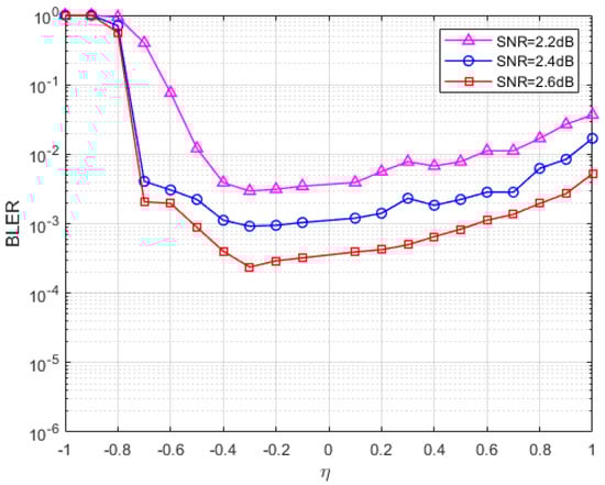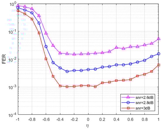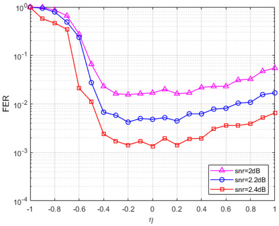 In Figure 1, the SNR and penalty parameters are fixed, and the FER of the parameters at different values is plotted. At least 200 errors were collected for each data point at three fixed SNRs (SNR = 2 dB, 2.2 dB, 2.4 dB). The maximum number of iterations in Figure 1 is set to 1000 times, and it can be seen from the figure that when the value is less than −0.3, the FER curve of the S-ADMM decoding algorithm decreases with the increase in the value, and when the parameter value is between −0.3 and 0.4, the FER reaches a lower peak, and when the value is greater than 0.3, the FER curve has a tendency to rise and increase after that. It can be found that when the parameter value is between −0.3 and 0.2, the S-ADMM decoder has better error correction performance. So, we choose a relatively stable value of −0.15. Similarly, for the code in Figure 2, we find a stable value of −0.3 and a similar one for in Figure 3. In the following performance analysis, we will conduct experiments using the analyzed optimal parameters.