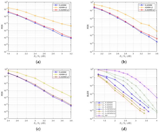 Decoding performance corresponding to six types of codes. They are listed as follows: (a) The FER of the S-ADMM, ADMM-, and A-ADMM- decoders of code. (b) The FER of the S-ADMM, ADMM-, and A-ADMM- decoders of code. (c) The FER of the S-ADMM, ADMM-, and A-ADMM- decoders of code. (d) The BLER of the S-ADMM, BP, and A-ADMM- decoders of three types of 5G codes.