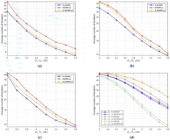 Figure 5 illustrates the average number of decoding iterations required by the ADMM-, the A-ADMM-, and the S-ADMM decoding algorithms for different codes. Specifically, when the SNR is 2.8 dB, the ADMM- requires an average of 11.8 and 22.6 iterations, respectively, for codes in Figure 5a and in Figure 5b. For the A-ADMM-, the average number of iterations decreases to 10.4 and 21.4, respectively. However, the S-ADMM decoding algorithm achieves even faster convergence, with average iteration counts of 9.2 and 18.2 for the same codes. This represents a reduction of approximately and , respectively, in the average number of decoding iterations compared to the ADMM-. For high-rate , the S-ADMM algorithm also reduces the average number of decoding iterations in Figure 5c. Figure 5d further demonstrates the comparative performance of the S-ADMM and A-ADMM- decoding algorithms for 5G LDPC codes. It is clear from the results that the S-ADMM decoding algorithm significantly accelerates convergence relative to A-ADMM- decoding, further emphasizing its efficiency in iterative decoding scenarios. These findings highlight the superior performance of the S-ADMM decoding approach, not only in terms of decoding speed but also in its ability to reduce computational complexity.
