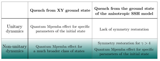 - Quench from an anisotropic Su–Schrieffer–Heeger (SSH) ground state. The system starts from the ground state of an anisotropic SSH model and evolves under the same -preserving Hamiltonian. Under unitary evolution, the symmetry remains broken, preventing the Mpemba effect from emerging. Strikingly, beyond a critical measurement rate, the symmetry is fully restored, triggering the Mpemba effect (see the right column of the table in Figure 1). This constitutes a genuinely measurement-induced symmetry restoration, with no counterpart in purely unitary dynamics.