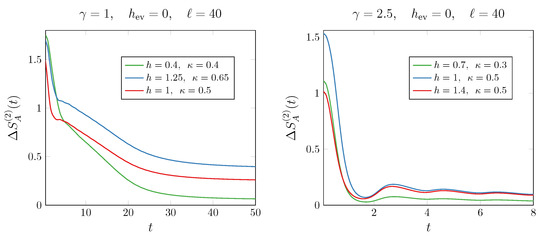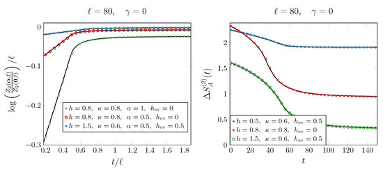 - Fagotti, M.; Calabrese, P. Evolution of entanglement entropy following a quantum quench: Analytic results for the XY chain in a transverse magnetic field. Phys. Rev. A 2008, 78, 010306. [Google Scholar] [CrossRef]