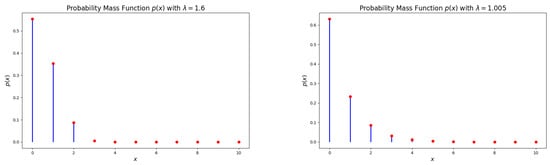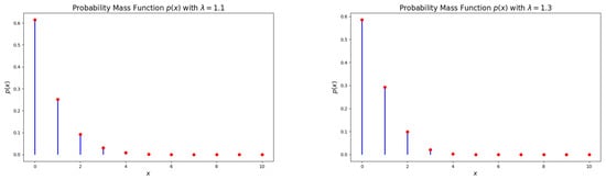 Graphical representations of the probability mass function (pmf) for the discrete Muth (DsMuth) distribution: (left) and (right). 1. Red dots represent the actual values of p(x) at specific points. 2. Blue line represents the probability distribution showing how the probability changes with different values of x.