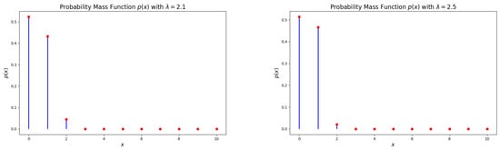 The probability mass function (PMF) of the DsMuth distribution, as stated in Equation (7), is log-concave for all values of . Figure 1, Figure 2 and Figure 3 illustrate various possible shapes of the PMF of the DsMuth distribution for various values of the parameter . It has been noted that the PMF of DsMuth is suitable for modeling positively skewed data with a unimodal shape for any value of .