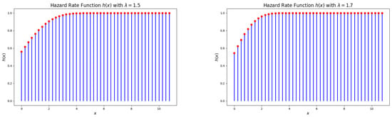 Plots of the hazard rate function (HRF) for the DsMuth distribution: (left) and (right). 1. Red dots represent the actual values of p(x) at specific points. 2. Blue line represents the probability distribution showing how the probability changes with different values of x.