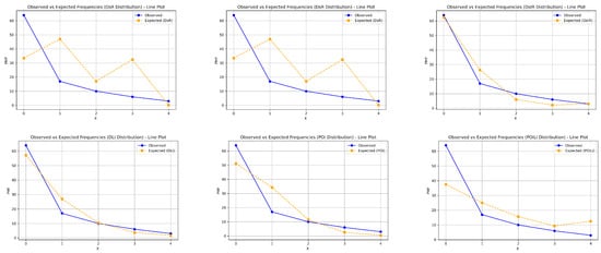 According to Table 5, the DsMuth distribution proves to be the best choice for evaluating these data compared to other competitive distributions, as it has the lowest values for AIC, BIC, and HQIC, in addition to the highest p-value among all the tested distributions. Figure 7 and Figure 8 illustrate the fitted PMF plots for all tested distributions, further supporting the empirical results presented in Table 5.