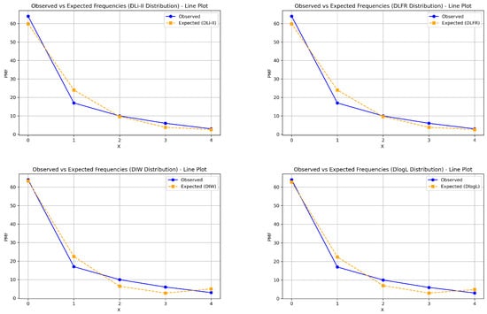 This section demonstrates the importance and superiority of the DsMuth distribution based on application to a real dataset. We compare the fits of the DsMuth distribution with several competitive distributions that have one or two parameters, including the discrete Rayleigh (DsR) [], discrete Inverse-Rayleigh (DsIR) [], discrete Lindley (DsLi) [], Poisson (Poi) [], discrete Poisson-Lindley (PoiLi) [], discrete Lindley-Two Parameter (DLi-II) [], discrete Linear Failure Rate (DLFR) [], discrete Inverse Weibull (DIW) [], and discrete Log-logistic (DLog-L) [] distributions, which are listed in Table 4. The comparison of the fitted models is made using several criteria, including the negative maximum log-likelihood (-log-Lik.), Akaike information criterion (AIC), Bayesian information criterion (BIC), Hannan-Quinn information criterion (HQIC), and Chi-square () with its corresponding p-value.