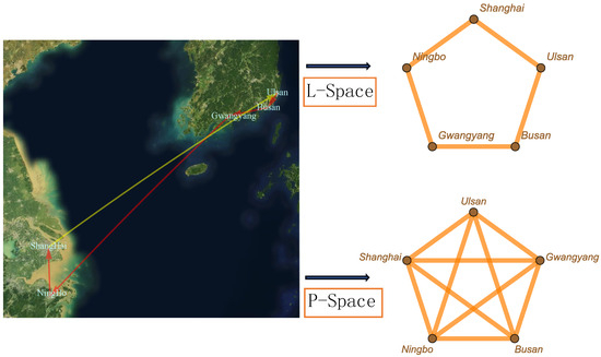 An example of one shipping line converted in to graph in L-space and P-space. The line goes from Ulsan, through the other four seaports, and back to Ulsan. The corresponding network contains five nodes and five edges within L-space, while P-space consists of 10 edges.