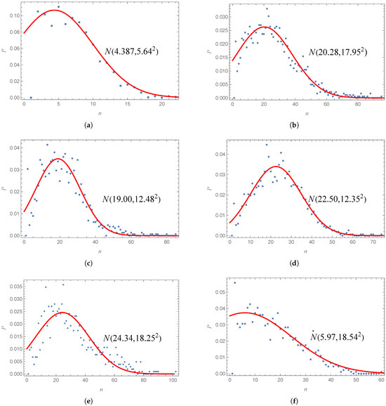 The distribution of the number of stations in each line of the worldwide marine transportation lines (a) and bus lines of Beijing (b), Shanghai (c), Guangzhou (d), Shenzhen (e), and Chongqing (f). The variable n represents the number of nodes in a single line, while p indicates the probability of this kind of line among all lines. The red lines represent the normal distribution function, with mean and standard deviation shown as in the corresponding image.