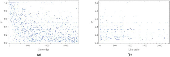 where represents the total number of nodes (seaports or stations) in the i-th event (line), and represents the number of new nodes involved in the i-th event. Figure 3 shows the distribution of the proportion p of new nodes in different lines, and most of these values are equal to 0. We can use the total number of stations (seaports) after removing duplicates, divided by the value of the total number of stations (seaport) in lines, to calculate the average probability of new points joining the network.