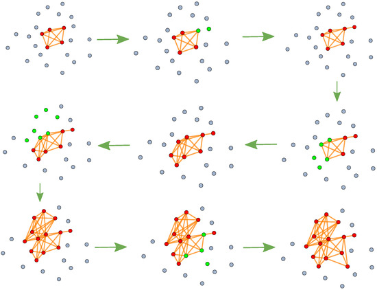 EL models are used to generate flow diagrams of complex networks. the green arrows represent the process of network evolution. The red nodes represent an existing network, the gray nodes are not included in the network, and the green nodes, which were chosen in this step, contain the joining and existing nodes. Finally, a complex network with 14 nodes and 41 edges is generated. The probability of an existing node being selected is proportional to its degree.