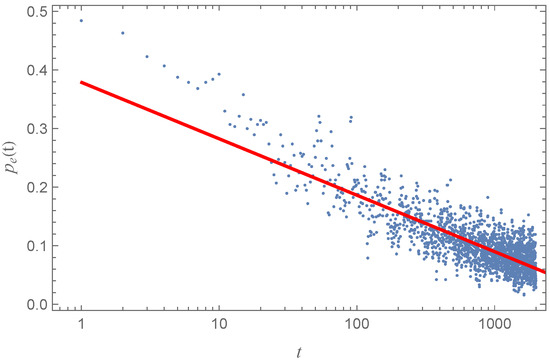 As shown in Figure 5, a simulation of repeated edge probability was conducted, and we find that the repeated edge probability satisfies a log function of the following form: . After several simulations, we find that the probabilities follow the formula , where a and b depend on the parameters in the EL model, and t represents the time step. Generally speaking, higher parameters of the average probability p of new points lead to smaller values of a and b. The probability of edge duplications generated within a network decreases rapidly with each subsequent step in the initial phase. This is because the network’s density tends to decline with growth if the average degree remains relatively stable. So, we can estimate that the edge number E is approximately equal to the average number of edges added in each step multiplied by the total number of steps in this model. The average number of edges is represented by the normalization of the total expression evaluated from to . The number of steps corresponds to the parameter N in the EL model, divided by the average number of nodes added in each step. Additionally, the edge count E should equal to