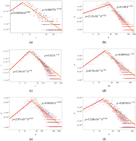 Degree distribution in the marine lines (a) and the bus lines of Beijing (b), Shanghai (c), Guangzhou (d), Shenzhen (e), and Chongqing (f). The inset shows the results on a log–log scale. The blue dots are statistical results from actual networks, and the red dots are the results of networks simulated by the EL model. The red lines represent the fitted lines of degree between (2, peak) of the actual data, and the orange lines represent the fitted lines of degree in the range of (peak, largest) of the actual data. The corresponding fit functions are shown in the figure. P and k are defined in the text. The p-values of all six orange lines are , , , , , and . All the values are far less than 0.05, indicating that all the data adhere to a power law distribution within the appropriate range.