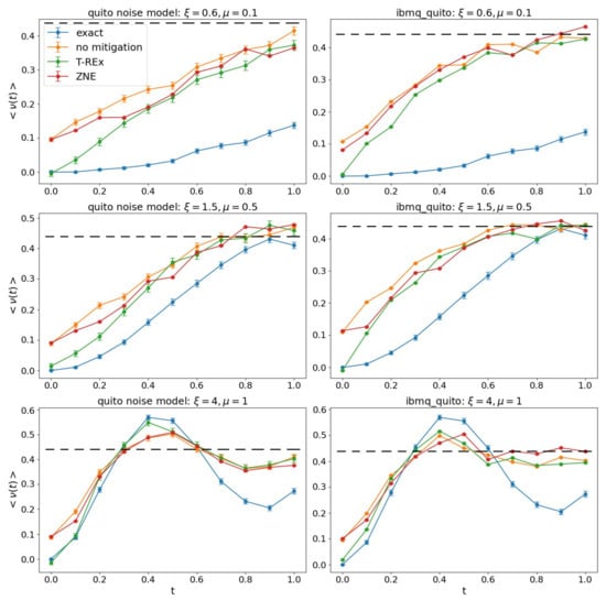 The ZNE mitigation is characterized by an almost identical curve with the unmitigated case, while the T-REx mitigation works better during the first time steps, where noise is mainly dominated by readout errors. We observe that the behavior of noisy and mitigated curves are more affected in the strong coupling case. However, in all cases, for longer times, the expectation value approximates the maximally mixed condition , showing that noise destroys any coherence. Also, for the real device ibmq_quito, the strong and intermediate couplings converge faster towards the maximally mixed condition than the corresponding noise model, probably because of the missing correlated noise in the assumed standalone gate hypothesis [], which neglects, for example, the noise propagation in subsequent applications of double qubit gates sharing a circuit line. The resilient behavior of the weak coupling regime may be due to the presence of the parameter in all double and triple qubits gates presented in Appendix B.