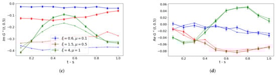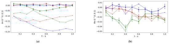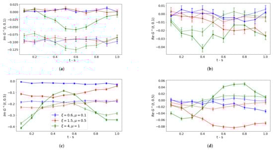 The real-time correlation function can be evaluated from Equation (14) only with the aid of the noise models because of the required high circuit depth, implying an execution time longer than the dephasing time of superconducting circuits. To do so, we use the circuit in Equation (15) by collecting measurements for any pair of Pauli string operators () in Equation (14) and by setting the phase to select the imaginary (real) part of lesser contribution. In Figure 3, we collect our results for bare noisy simulations (dashed lines) to be compared to the exact noiseless simulation (solid lines). To interpret the results, we notice that, since particle densities and are Hermitian observables, they contribute only to the imaginary part of lesser terms, while the 49 terms in Equation (14) related to Pauli strings contribute to both the real and imaginary parts. This might explain the offset between the exact results and bare noise simulations we observe in the imaginary part and not in the real one. Indeed, we can conclude that this offset is caused by the higher deviation between exact and noisy measurements of the density as observed in Figure 2. On the other hand, the 49 Pauli strings pairs, that might contribute with opposite signs, yield a lower deviation. This offset is almost identical for the imaginary part in panels (a,c) for any coupling regime because of the same readout errors and a negligible value of particle density for low values of s. For higher values of s, the deviation decreases in stronger couplings, even if oscillations observed in the noiseless case are damped in the presence of noise.