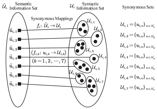 where denotes a set that contains the indices of the syntactic values with the same meaning as the semantic element k. It should be noted that a synonymous relationship itself is a form of a semantic knowledge base, which is consistent with the current consensus: by applying specific prior knowledge or criteria to determine synonymous relationships for actual source information, all syntactic data within the constructed synonymous sets share common information corresponding to that prior knowledge or criteria.