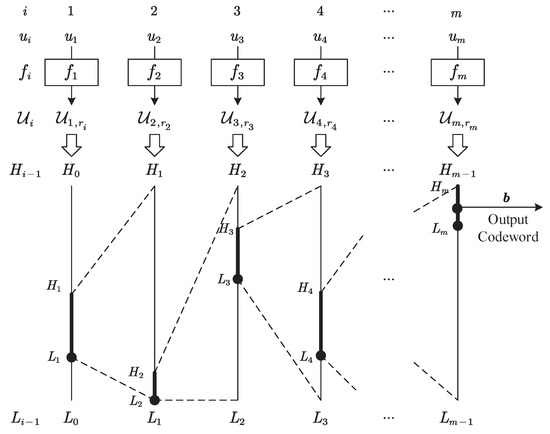 - Update decoding interval: Based on the determined synonymous set and the probabilities for all synonymous sets , update the decoding interval and its interval length with