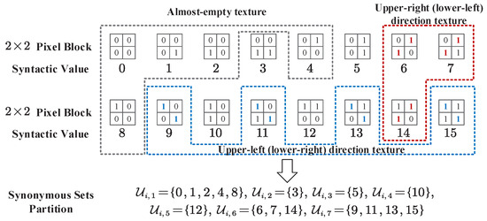To construct the synonymous mappings, we regard each non-overlapping -pixel block as a syntactic symbol so that the edge texture maps can be considered a syntactic sequence of length . On this basis, we partition the 16 syntactic symbols into seven synonymous subsets based on Figure 3, in which each synonymous set represents a type of local edge texture semantic. For example, the first synonymous set (“almost empty texture”) includes all the all-zero and single blocks, while the last synonymous set (“upper-left (lower-right) direction texture”) includes all the blocks that can be regarded as being in the upper-left or lower-right. We assume that syntactic sequences satisfy the i.i.d. assumption and the probabilities of syntactic symbols. The synonymous sets in the encoding and decoding process are directly obtained based on probability statistics and are synchronized at both ends.