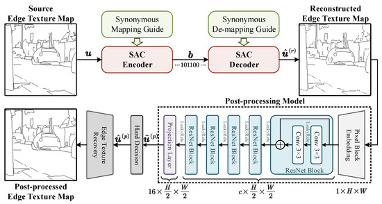 Figure 4 shows the overall SAC processing flow for edge texture maps of natural images. First, the SAC encoder compresses the source edge texture map at the semantic level instructed by synonymous mappings and produces the output bitstream . Then, the SAC decoder reconstructs the source information using the bit stream under the guidance of synonymous de-mapping. Finally, a neural network model is used for syntactic post-processing, followed by a hard decision module and an edge texture recovery module to obtain the final post-processed edge texture map .