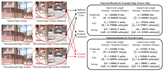 Based on these results, it is evident that compression efficiency was significantly improved using SAC. From the perspective of the actual code length, SAC provided effective compression efficiency improvements compared with the traditional method. For the example edge texture map shown in Figure 5, SAC saved 26,515 sebits [32] compared with traditional arithmetic coding, equivalent to a 12.9% improvement in compression efficiency. As for the entire test set, SAC saved an average of 29,085.1 sebits of code length compared to traditional methods, equivalent to a 20.5% improvement in the average compression efficiency. This demonstrates that SAC significantly improves compression efficiency compared to traditional arithmetic coding with semantic losslessness.