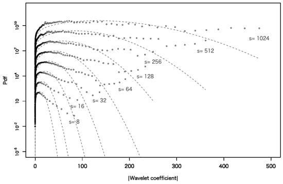 The PDFs of the absolute values of the wavelet coefficients on several time scales for data set 1. The time scale is indicated next to each curve. The Gaussian distribution with the same mean and variance is shown as a dashed line. Each curve is vertically shifted for better readability.