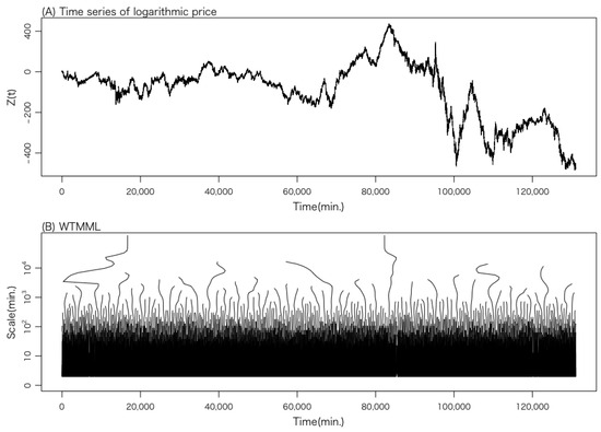Figure 2 illustrates the original time series and the WTMML extracted from this time series for data set 1. The cascade of volatility occurs from top to bottom. Therefore, sections of the WTMML moving to the right indicate a causal cascade, while sections moving to the left indicate an anti-causal cascade. This point will be discussed later.