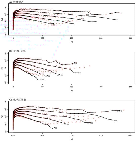 Here, , where L is an appropriately chosen macroscopic scale parameter, taken as the length of the time series used in the empirical study of this article. Furthermore, and are independent Brownian motions. The parameters and , as well as the functions and , are estimated from the time series data, as described later. Note that, in this study, the product between the function and the Brownian motion follows the Stratonovich product (denoted by ∘). In [35], the Itô product was used. The Stratonovich product between the system variable x and the Brownian motion can be expressed using the Itô product (denoted by ·) as follows [48]:
