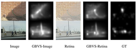 Comparison results of the original image and the image applied retina imitation on the Toronto dataset [] and the MIT1003 dataset []. Most of the methods listed in this table belong to the bottom-up saliency prediction models. Scores in bold mean the better performance between the original image and the image applied retina imitation.