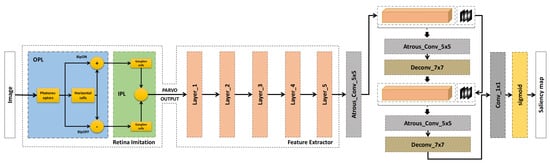 The human retina is a sophisticated network composed of photoreceptors, horizontal cells, bipolar cells, ganglion cells, and amacrine cells, which collaboratively initiate the complex process of visual information processing []. These cellular interactions are organized into two principal layers: the Outer Plexiform Layer (OPL) and the Inner Plexiform Layer (IPL). For the purpose of image saliency prediction, which primarily relies on static visual features rather than motion cues, our focus is directed towards the Parvocellular (Parvo) channel. The Parvo pathway is dedicated to high-resolution detail extraction and efficient information encoding, making it especially pertinent for identifying salient features within an image by reducing entropy and preserving crucial information.