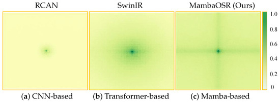 Comparison of Effective Receptive Field (ERF) for (a) the CNN-based method, RCAN [3], (b) the transformer-based model, SwinIR [4], and (c) the proposed Mamba-based network, MambaOSR. A larger ERF is represented by a wider distribution of dark areas. The proposed MambaOSR achieves the largest ERF, demonstrating its superior global context modeling capability.