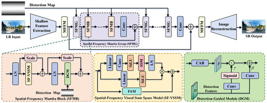 - To further enhance global context modeling, we propose an SF-VSSM. Specifically, the SF-VSSM integrates an FAM with the VSSM to adaptively exploit frequency-domain information beneficial to the ODISR task. This integration enhances the model’s ability to capture global structural features and improves the reconstruction accuracy.