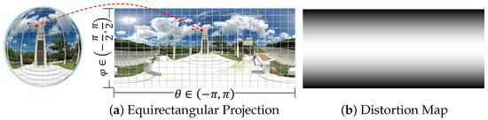 and are coordinate transformation functions mapping spherical coordinates to the projection plane. As shown in Figure 3b, the original ODI exhibits geometric distortion when projected onto the ERP plane, characterized by latitudinal variation and hemispheric symmetry. This distortion motivates the formulation of a distortion map for low-resolution images. Given an LR image (where denote height, width, and channel dimensions, respectively), the corresponding distortion map is formulated as follows [45]: