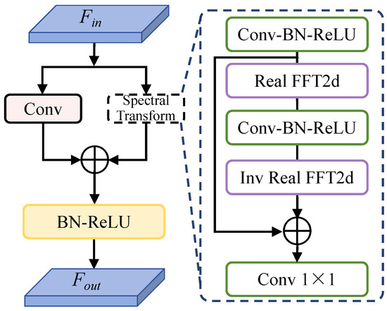 As shown in Figure 4, the FAM adopts a dual-branch framework: a convolution branch for spatial feature extraction and a spectral transform branch for frequency-domain feature modeling. The spectral transform branch utilizes the Real Fast Fourier Transform (Real FFT) to represent image features. By exploiting the conjugate symmetry property of the Fourier transform, Real FFT processes only half of the spectrum (positive frequencies), significantly improving the computational efficiency. The spectral transform branch leverages its global receptive field to capture global context, while the convolution branch employs local kernels to model fine-grained details. By integrating their outputs, the dual-branch architecture expands the model’s receptive field and mitigates information loss that typically occurs during localized processing in reconstruction tasks. This fusion enhances the retention of critical image features and improves the structural similarity between the reconstructed image and the original high-resolution image. The specific operational architecture of the spectral transform is detailed in Figure 4. From the perspective of information theory, this integration increases the mutual information between the reconstructed image and its high-resolution counterpart, ensuring a more precise reconstruction.
