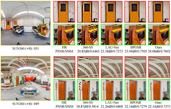 - Deng, X.; Wang, H.; Xu, M.; Guo, Y.; Song, Y.; Yang, L. Lau-net: Latitude adaptive upscaling network for omnidirectional image super-resolution. In Proceedings of the IEEE/CVF Conference on Computer Vision and Pattern Recognition, Nashville, TN, USA, 20–25 June 2021; pp. 9189–9198. [Google Scholar]