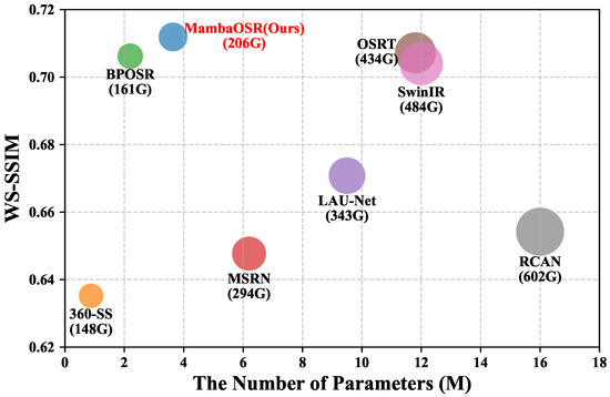 To comprehensively evaluate the performance of different methods, we compare the number of parameters and computational complexity of each method. The specific results are shown in Figure 8. Our method has a noticeable advantage over OSRT [2] and SwinIR [4] in the number of parameters and computation abilities, and it achieves significantly better performance in the WS-SSIM metric. Compared to the recently proposed method, BPOSR [24], although it has advantages in parameter count and computation, our method outperforms BPOSR by 0.057 on the WS-SSIM metric. Furthermore, the input size of BPOSR is 32 times larger than ours. In particular, in the SR task, our method follows the design principle of OSTR with an input size of , while the input size of BPOSR is . It is worth noting that the input resolution is crucial in the SR task because it directly affects the model’s ability to perceive global information. Larger input sizes usually provide more details and contextual information, thus enhancing the model’s ability to capture global structures and details. Notably, even with this resolution disparity, our method outperforms BPOSR in both quantitative metrics and qualitative comparisons. The superior performance achieved with significantly smaller input patches highlights our model’s advantages concerning efficient information utilization and architectural design.