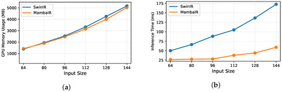 Comparison of (a) GPU memory consumption and (b) inference latency across varying input resolutions. We chose SwinIR (a Swin transformer-based method) and MambaIR (a Mamba-based method) for comparison. We adjust the model to ensure the GPU usage is roughly similar at the beginning, and then we increase the input resolution from to .