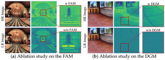 Comparison of feature maps in ablation studies. (a) Ablation study on the FAM: Feature maps with an FAM exhibit an enhanced ability to extract high-frequency information, resulting in sharper edges and finer texture details, while those without an FAM show blurred textures and loss of detail. (b) Ablation study on the DGM: Feature maps with a DGM effectively restore texture details in distorted regions, addressing projection distortions, whereas those without a DGM display limited recovery and less coherent structures.