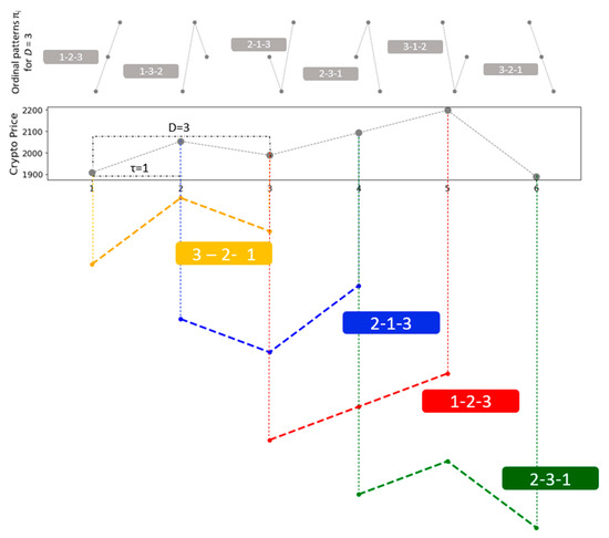 An illustration of identifying ordinal patterns to a cryptocurrency time series (dimension D = 3 and an embedding delay τ = 1). At the top, the resultant ordinal patterns πi for D = 3 are presented. At the bottom, the methodology applied to a cryptocurrency time series with τ = 1 is found. The pattern is obtained by replacing the original values with their corresponding rankings, (adapted from [17,18]).