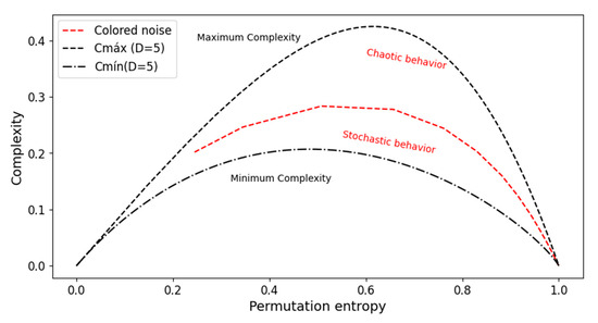 Illustrative representation of the complexity–entropy causality plane (CECP) [13]. In the dashed line are represented the maximum and minimum boundaries for D = 5, as well in red the colored noise with the approximate identification of chaotic and stochastic zones [18].