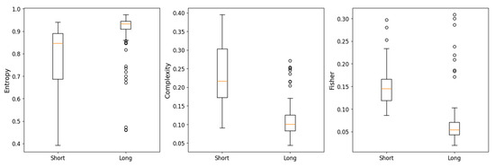 As shown in Figure 5, in all instances, the complexity, entropy, and Fisher parameters exhibit significantly greater variability in the short series compared to the long series. The long series demonstrate more stable parameter values, with a higher median entropy, lower complexity, and lower Fisher values when compared to the short series.