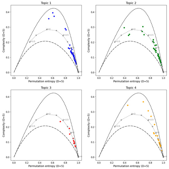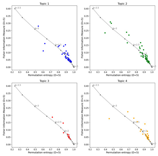The Fisher information measure vs. permutation entropy plane is shown in Figure 7, comparing the different topics identified in this study. No significant differences in behavior are observed between topics. In all cases, most series are concentrated near the noise curve between k = 0 and k = 2.5, with greater dispersion for higher k values.