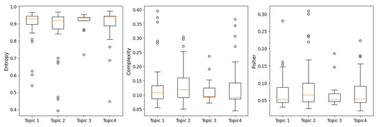 In Figure 8, the box plots compare the different topics in terms of parameters such as entropy, complexity, and Fisher information. The graphs show that no significant differences exist in the mean values.