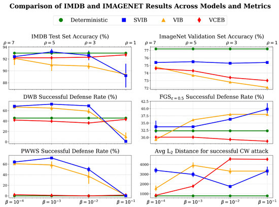 Performance comparison across models and metrics for IMDB and ImageNet. Higher is better ↑ in all plots. Analyzing accuracy and robustness against adversarial attacks for deterministic MLE, SVIB, VIB, and VCEB models under varying and values, averaged over five runs with standard deviation. Left column features IMDB tasks, right column features ImageNet tasks. Upper row shows accuracy over test set, and bottom rows depict robustness under various adversarial attacks, presented as the rate of deflected attacks or as the average distance required for a successful CW attack. Results show that SVIB consistently attains higher test set accuracy and higher or on-par robustness in all attacks apart from the targeted CW attack. values apply to VCEB models, while values apply to SVIB and VIB models. SVIB results are presented for in IMDB and in ImageNet. For all experimental results please see Appendix C.1.