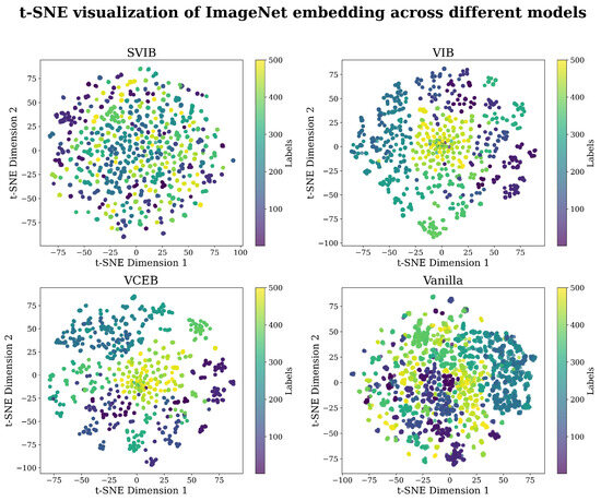 ImageNet embeddings of the different models casted to 2D using the t-SNE algorithm [38]. 5000 datapoints of the first 500 ImageNet labels. The VIB and VCEB castings share similar traits of well-separated clusters, while the deterministic MLE casting shows some clustering that seems less formed and unseparated. The SVIB casting shows very little clustering and features the most dispersed distribution. The visualization suggests that the conditional entropy term in SVIB has negated the clustering effect of the ELBO loss and induced a more uniform representation.