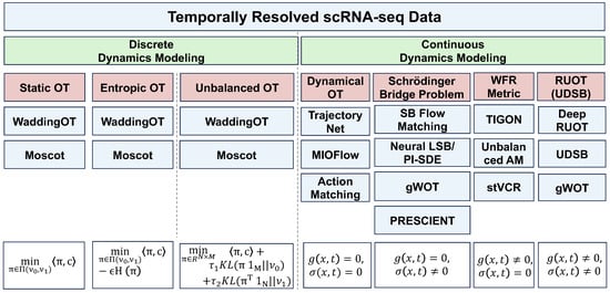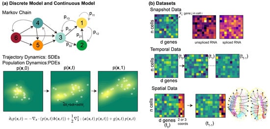 Recently, many reviews have provided comprehensive summaries of the methods and advancements in the study of single-cell dynamics. For example, ref. [42] reviewed various pseudotime inference methods. Ref. [43] conducted a comprehensive benchmarking study on pseudotime inference methods. Refs. [27,42,44] reviewed RNA velocity methods in single-cell transcriptomics. [27] also discussed the limitations and potential extensions of RNA velocity. Refs. [4,5,13,45] provided an in-depth analysis of the application of optimal transport theory in single-cell or spatial omics data. Additionally, refs. [1,3] examined various perspectives on cellular dynamics, exploring how the reconstruction of cell states and energy landscapes can contribute to our understanding of cellular behavior and development. The current review takes a distinct perspective by systematically discussing modeling strategies for different types of data from a dynamical modeling perspective, aiming to unify and expand upon the current methodologies in the field.